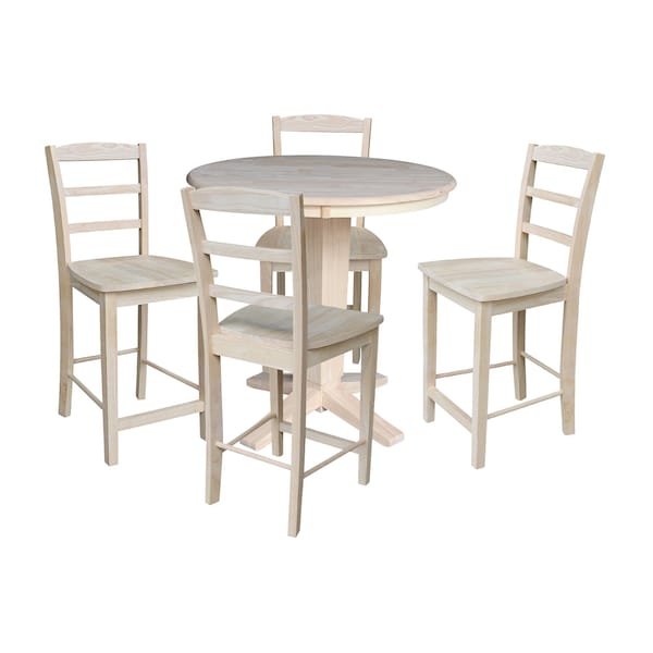 36 in. Solid Wood Round Top Pedestal Dining Table with 4 Counter Height Stools, Unfinished