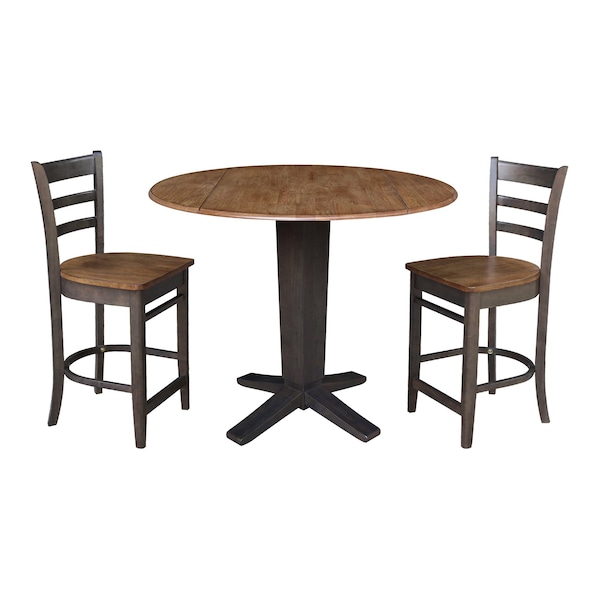 42 in. Solid Wood Dual Drop Leaf Dining Table with 2 Counter Height Stools in Hickory/Washed Coal