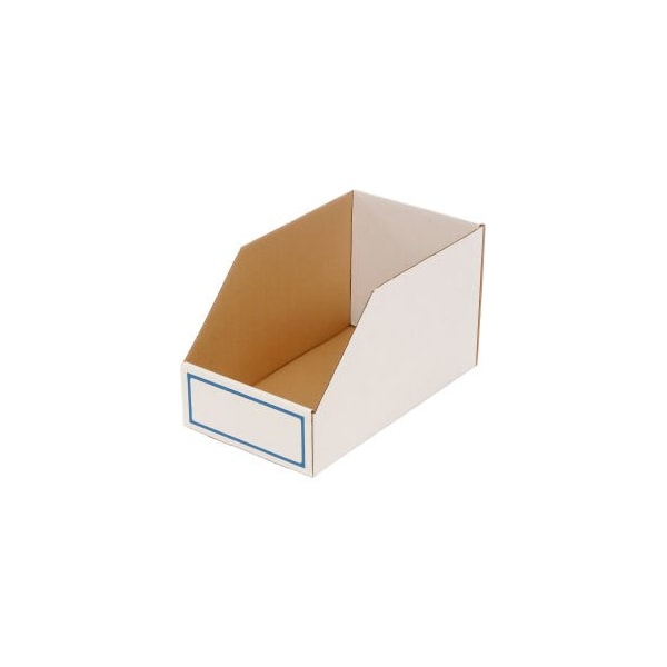 FOLDABLE CORRUGATED SHELF BIN 9-3/4"W X 17-1/2"D X 10"H, WHITE HANDY, REUSABLE BINS HAVE A THOUSAND AND ONE USES. KEEP SMALL PARTS EASILY VISIBLE AND ACCESSIBLE. CONSTRUCTED OF HEAVY-TEST WHITE FACED CORRUGATED FIBERBOARD. SELF-LOCKING FOR EASY SET-UP, KEEPS BINS RIGID. FITS ALL STANDARD SHELVING. FEATURES INVENTORY CONTROL CARD TO HELP KEEP MAINTAINING SUPPLIES SIMPLE. SELECT EXTRA-LARGE BINS FOR USE WHERE ADDITIONAL HEIGHT IS NECESSARY.