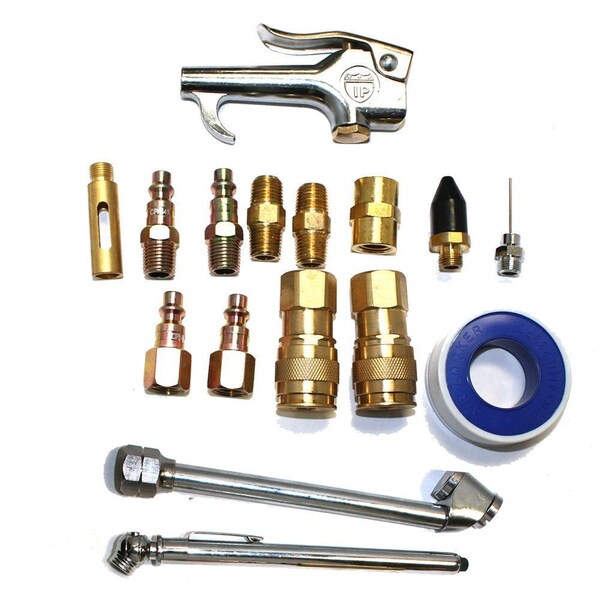 Kit Includes: CG440B - 1/4" x 1/4" FPT Universal Brass Coupler (02) CPH440 - 1/4" x 1/4" FPT Industrial Coupler Plug (02) CPH441 - 1/4" x 1/4" MPT Industrial Coupler Plug (02) TG195 - Tire Pressure Gauge - 10-50 PSI - Pencil Type - Standard Pocket Gauge (01) TT33 - 1/2" x 33 ft Teflon Tape (01) FPC440 - 1/4" FPT x 1/4" FPT Brass Female Coupling (01) FA414 - 1/4" NPT Brass Hex Male Nipple (02) B300 - 1/4" FPT Standard Thump Lever - w/o Tip Blow Gun (01) BT2 - 1/8" MPT Rubber Tip (01) BT6S - 1/8" MPT Standard Brass Safety Tip (01) BTN1 - 0.0425" x 7/8" Long Needle Tip (01) BT1 - 1/8" MPT Brass Tip (01) T37 - 1/4" FPT Dual Foot 6" Truck Chuck (01)