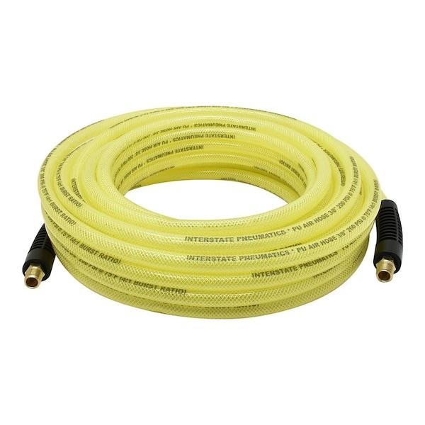 The Interstate Pneumatics HU56-025 Rhino PolyFlex 3/8" x 25 FT Polyurethane Air Hose is a durable, lightweight, and flexible hose for construction, automotive, and other demanding applications. It is made from braided polyurethane that resists oil, grease, and surface wear while staying flexible in temperatures as low as -40°F. The hose lays flat during use and will not kink or coil back, even in cold weather. The bright yellow color improves visibility and makes it easy to follow across floors, walls, or equipment. Each end includes solid brass 1/4" NPT fittings and bend restrictors that help reduce strain at the connection points.