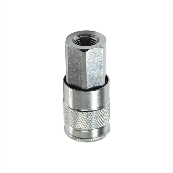 Interstate Pneumatics CA640Z 3/8 Inch x 1/4 Inch FPT Auto Steel Coupler Reducer - Silver. these couplers are interchangeable with the Automotive (True-Flate) Standard series couplers produced by other manufacturers. Precision machined from solid steel bar stock, which provides longevity during mechanical shock in rugged applications. Maximum working pressure 300 PSI.
