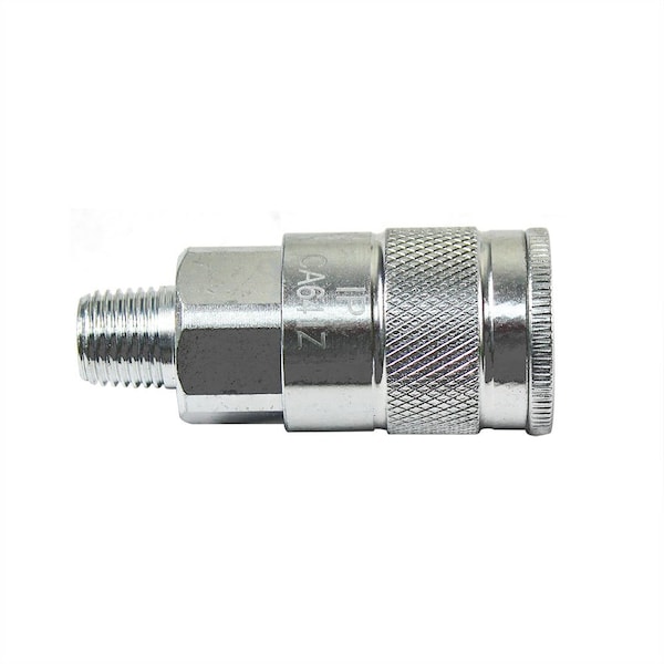 Interstate Pneumatics CA641Z 3/8 Inch x 1/4 Inch MPT Auto Steel Coupler Reducer - Silver. These couplers are interchangeable with the Automotive (True-Flate) Standard series couplers produced by other manufacturers. Precision machined from solid steel bar stock, which provides longevity during mechanical shock in rugged applications. Maximum working pressure 300 PSI.