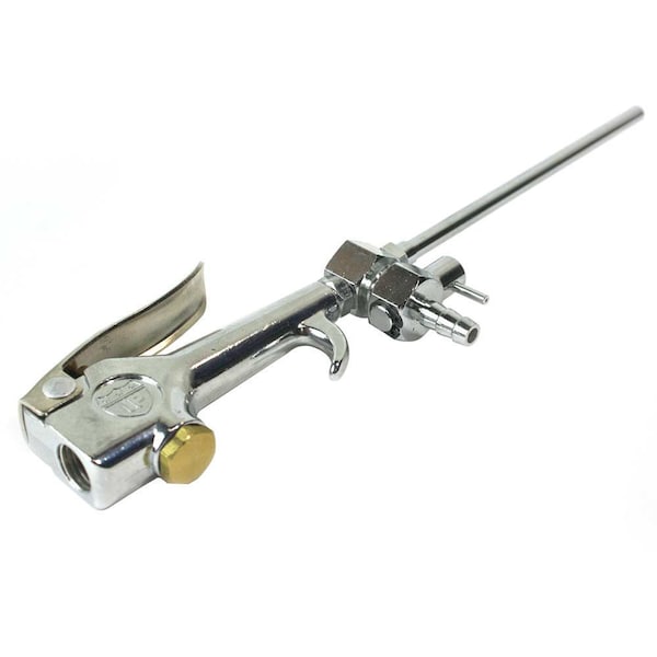 The Interstate Pneumatics Siphon Spray Gun blows air / liquid (cleaning solution) to clean auto engines and other mechanical parts , it comes with a control valve to regulate density of mist. This blow gun is perfect for removing dirt, grime, and grease. It combines water/cleaning solution and air pressure to quickly clean, yet will not harm finishes. Comes standard with an extended tip (6" long) on this siphon spray blow gun along with 8ft of 1/4" Braided PU Hose.