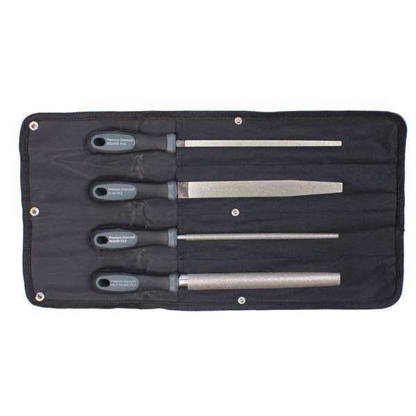 The #8108 Diamond File Set includes the bestcontoured files available on the market today. Thesefour abrasive, diamond-coated files (Half Round, Round, Flat and Square) are harder than traditionalfiles, and can be used in any direction, cutting faster and smoother for a better finish