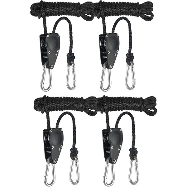* Specification: pair of 1/4inch heavy duty rope hangers, 8-feet long, 4 easy-to-use Carabiner clips. Up to 150-pound load capacity per ratchet, 300-pounds per pair