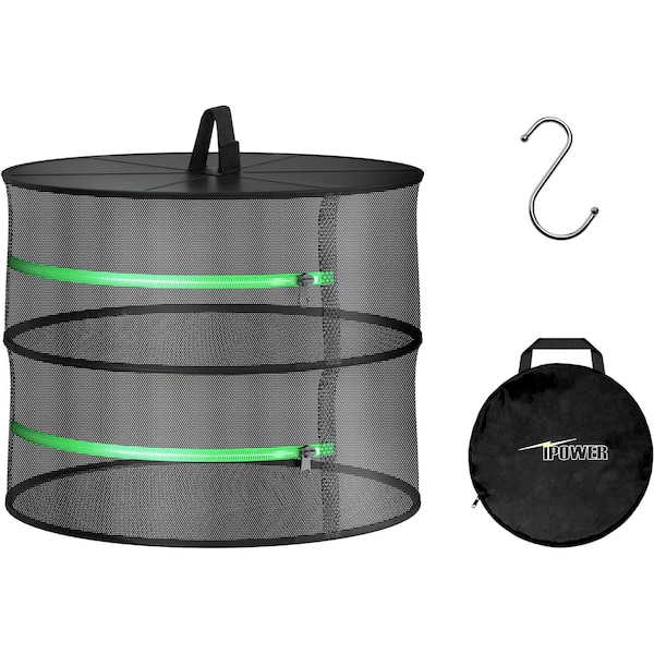 iPower 2ft 2-Layer Foldable Herb Mesh Rack Hanging Drying Net with Zippers Heavy Duty Ring for Hydroponic Plant, Free Storage Bag and Hook Included, for Herbs Petals Plants Vegetables Fruits