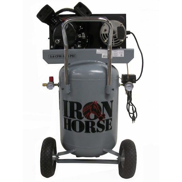 The Multi voltage 110 & 220 volt Iron Horse 20 gallon portable air compressor is equipped with a heavy duty V-twin, cast iron compressor head that pumps out 5.6 CFMs at 90 PSI. The flexible votage option allows the unit the unit transition from job site to home shop etc accomodating 110 or 220 volt power for whichever is availble. The 10 all terrian flat free tires and vertical tank orientation allows the unit to be moved seemlessly from place to place. An ideal compressor option for home use or on the job site for the contractor.