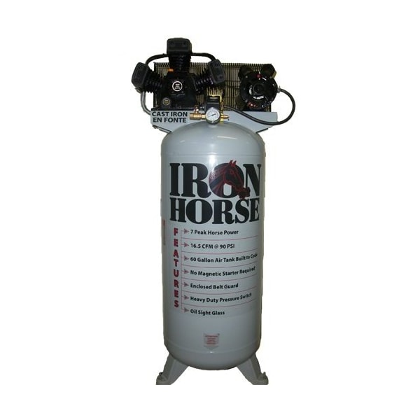 The Iron Horse 60 gallon shop compressor is paired with a heavy duty v-style cast iron compressor head that produces 16.5 CFMs of air with a max pressure of 135 PSI. The powerful 5hp belt driven unit is loaded with features that rise above the competitors. The convenient oil site glass allows you to keep a check on oil levels at a glance. The government certified ASME 60 gallon tank & safety pressure release gives you the extra assurance for you to know you have the best quality avaialble and your safety is feature #1. The large mounting saddle makes room for the V style pump,which minimizes vibration and allows the unit to operate at lower RPMs generating less friction and less heat which adds up to extended life. The Iron Horse unit has a full metal belt guard no plastic parts on this model! that meets or exceeds UL & OSHA requirements. Equipped with a heavy duty ON/OFF pressure switch, 1/2 ball valve outlet, dual air filter system and manual tank drain, this unit is full of bonus features at a value price!