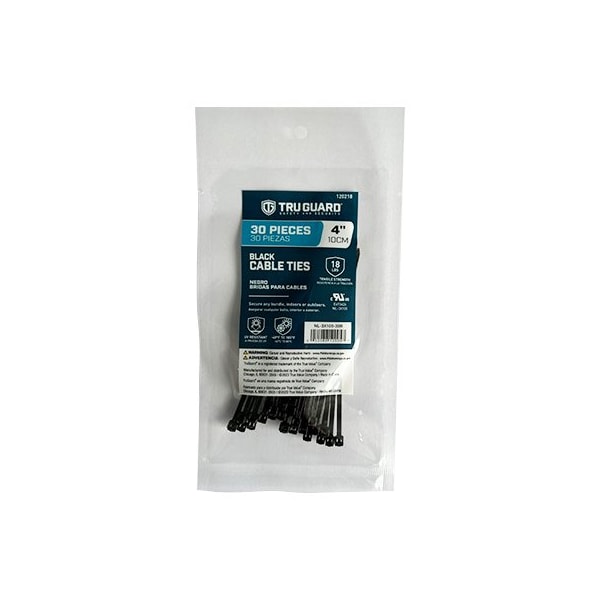 Tru-Guard 30 Pack 4 Black Cable Tie Nylon 18 Lb Tensile Strength Self Locking Bagged.