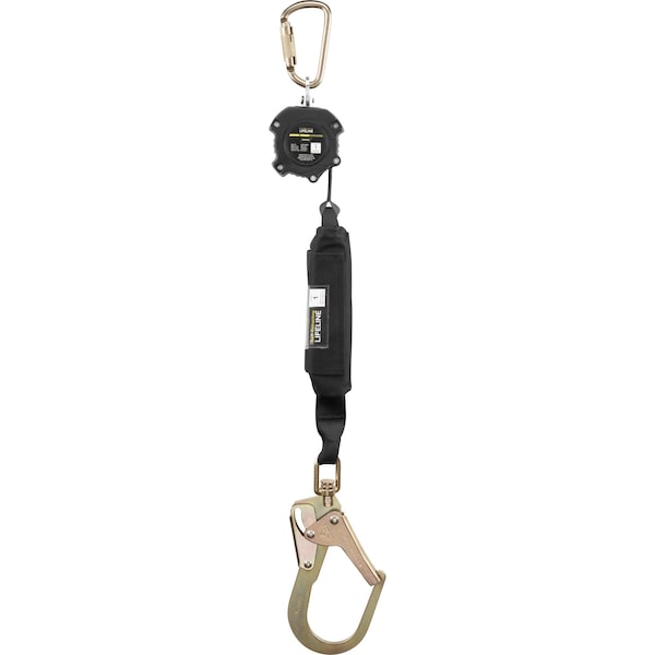 The Ironwear 2206-SRH SRL features a housing unit containing a 6-ft-long webbing strap with an integrated shock pack, and a swiveling, self-locking carabiner on one end + a swiveling, self-locking steel rebar hook on the other.
