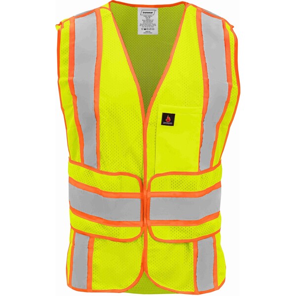 The Ironwear 1290 Type R safety vest features hi-vis trim, with 2 in hi-vis silver reflective tape over 3 in contrasting fabric and a unique 2 in hi-vis chevron pattern on the back for protection that meets ANSI/ISEA Class 2 standards. This 100% polyester mesh vest is treated with Flame-retardant properties and tested under ASTM D6413 methods to self-extinguish when caught on fire. A 5-point breakaway system is also included for personnel working near moving machinery with risk of entanglement, with an adjustable, wraparound hook and loop closure that can be easily modified for the best fit, as well as a hook and loop front closure for easy on and off. This safety vest is ideal to protect against fire hazards and boost visibility in all but the most demanding applications – from factory workers, utility workers and maintenance workers to jogging, cycling, walking or fishing. To clean, simply handwash in warm water and mild detergent, then leave to air dry. For heavy soiling, gently spot clean with a mild soap. Do NOT machine dry. Do NOT use sanitizers or aggressive cleaning solutions such as bleach or acetone. Employing cleaning methods other than those outlined above may shrink the vest, ruin the reflective tape or dim the coloring below safe standards.
