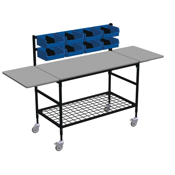 Lg Mobile Table w/Drp Lves, 2 Row Bin Rack, 8 Bins, Mid & Btm Grid Shlf