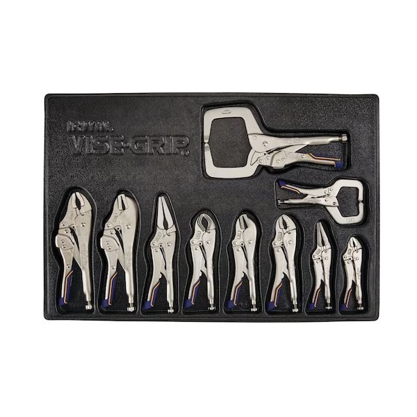 Locking Pliers Set, Plier Types Locking Pliers, Jaw Shape Curved, Handle Style Ergonomic, Jaw Opening Type 1-Handed, Jaw Bend 0 Degrees , Overall Length 5 in, 6 in, 7 in, 9 in, 10 in, 11 in, Maximum Jaw Opening 1 1/8 in, 1 1/2 in, 1 7/8 in, 2 in, 2 1/8 in, 2 3/4 in, 4 in, Jaw Length 1/4 in, 3/4 in, 1 in, 1 1/4 in, 1 1/2 in, 1 3/4 in, 2 1/2 in, Additional Tool Functions Wire Cutter, Tether Ready No, Number of Pliers 10, Container Type Tray