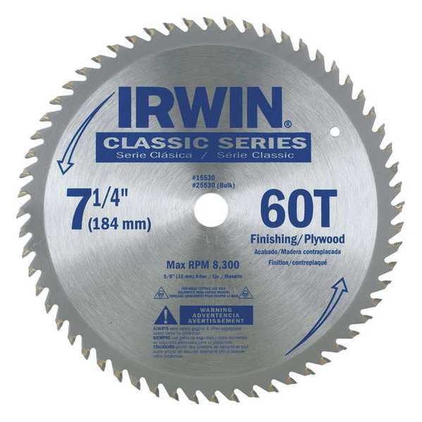 Circular Saw Blade, Blade Dia. 7 1/4 in, Diamond Knockout Diamond Knockout Included, Number of Teeth 60, Tip Material Steel, Hook Angle 18 Degrees , Tooth Grind ATB, Blade Type Finishing, Plate Thickness 0.055 in