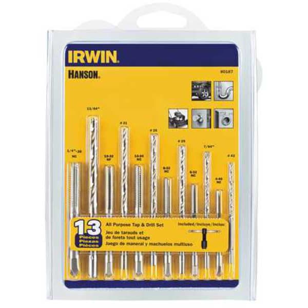 Drill Bit and Tap Set, Number of Pieces 13, Drill Bit Material High Speed Steel, Drill Bit Finish Black Oxide, Drill Bit Dia. Included #21, #25, #29, #35, #43, #7, Measurement System Fractional Inch, Drill Bit Point Angle 135 Degrees , Impact Rated Not Impact Rated, Smallest Drill Bit Dia. #43