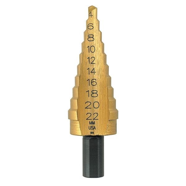 Step Drill Bit, High Speed Steel, TiN, 4 mm to 22 mm Size Range, Hex, 1/4 in Shank Hex Size, 3/8 in Shank Diameter, 2 15/16 in Overall Length, Maximum Drilling Depth 3.5 mm
