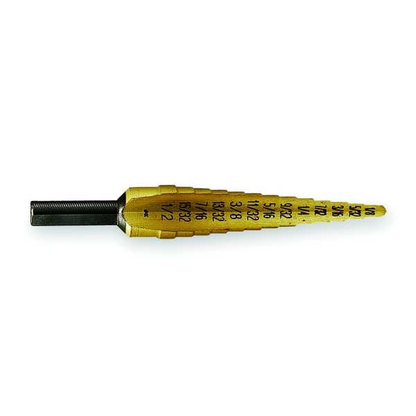 Step Drill Bit, High Speed Steel, TiN, 1/8 in to 1/2 in Size Range, Hex, 1/4 in Shank Hex Size, 1/4 in Shank Diameter, 3 3/16 in Overall Length, Maximum Drilling Depth 1/8 in