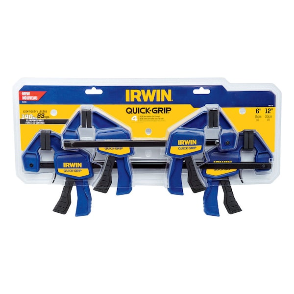 The IRWIN QUICK-GRIP One-Handed Mini Bar Clamp 4 Pack, Light-Duty, is the perfect clamp set for smaller projects and working in confined spaces. Reinforced resin bodies and hardened steel bars ensure strength and durability. These clamps feature non-marring pads to protect work surfaces, one-handed quick-release triggers and provide 140 lbs. of clamping force. Set includes two 6" and two 12" One-Handed Mini Bar Clamps.