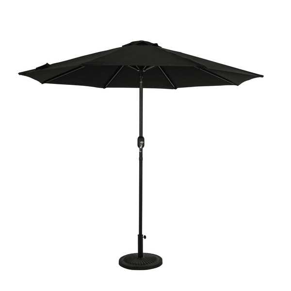 Patio Umbrella, Canopy Color Black, Includes Base No, Includes Lights No, Number of Ribs 8, Opening Mechanism Hand Crank, Overall Diameter 9 ft, Overall Height 7 3/4 ft, Pole Color Bronze, Pole Diameter 1 1/2 in, Pole Material Aluminum, Tilting Yes, Canopy Shape Octagon, Tilt Mechanism Hand Crank, Features 1-Year Warranty on Structure, 3-Year Warranty on Fabric, Overall Length Not Applicable, Overall Width Not Applicable, Resistance Properties Fading Resistant, Mildew Resistant, Water Resistant