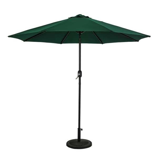 Patio Umbrella, Canopy Color Hunter Green, Includes Base No, Includes Lights No, Number of Ribs 8, Opening Mechanism Hand Crank, Overall Diameter 9 ft, Overall Height 7 3/4 ft, Pole Color Bronze, Pole Diameter 1 1/2 in, Pole Material Aluminum, Tilting Yes, Canopy Shape Octagon, Tilt Mechanism Hand Crank, Features 1-Year Warranty on Structure, 3-Year Warranty on Fabric, Overall Length Not Applicable, Overall Width Not Applicable