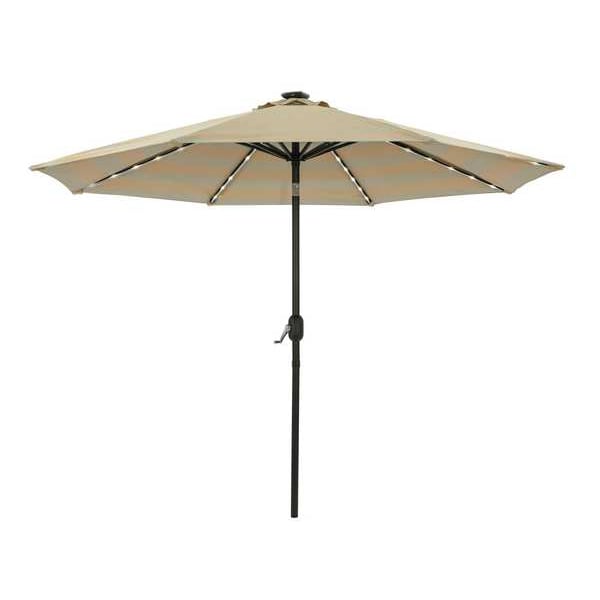 Patio Umbrella, Canopy Color Champagne/Taupe, Includes Base No, Includes Lights Yes, Number of Ribs 8, Opening Mechanism Hand Crank, Overall Diameter 9 ft, Overall Height 7 7/8 ft, Pole Color Bronze, Pole Diameter 1 1/2 in, Pole Material Aluminum, Tilting Yes, Canopy Shape Octagon, Tilt Mechanism Hand Crank, Features 1-Year Warranty on Structure, 3-Year Warranty on Fabric, Overall Length Not Applicable, Overall Width Not Applicable