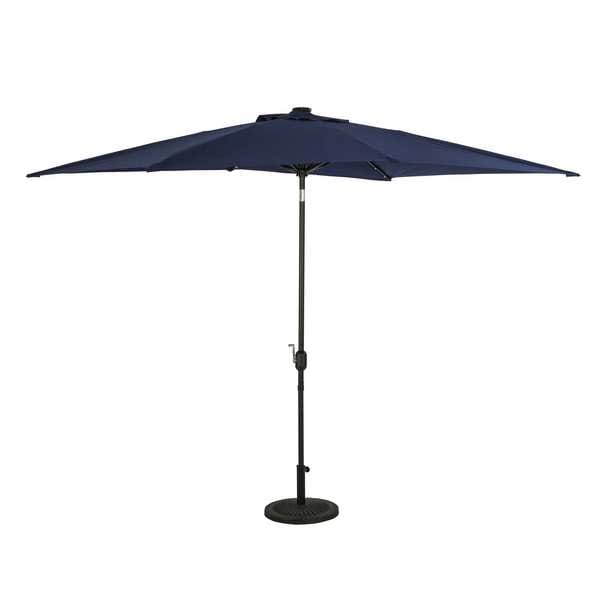 Patio Umbrella, Canopy Color Navy Blue, Includes Base No, Includes Lights Yes, Number of Ribs 6, Opening Mechanism Hand Crank, Overall Diameter Not Applicable, Overall Height 7 7/8 ft, Pole Color Bronze, Pole Diameter 1 1/2 in, Pole Material Aluminum, Tilting Yes, Canopy Shape Rectangle, Tilt Mechanism Hand Crank, Features 1-Year Warranty on Structure, 3-Year Warranty on Fabric, Overall Length 10 ft, Overall Width 6 1/2 ft