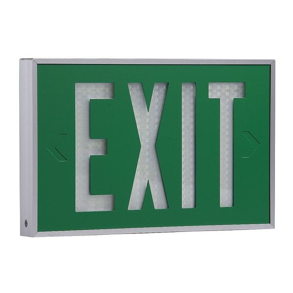 Self-Luminous Exit Sign, Green Background Color, 1 1/2 in Overall Depth, 8 1/4 in Overall Height, 12 3/4 in Overall Width, Directional Indicators Universal Field Selectable Chevrons, Aluminum Housing Material, Life Expectancy 10 yr, Number of Faces 1, Mounting Location Wall, Wet Location Rated Environmental Rating, Painted Housing Finish, Lighting Technology Tritium, 10 Yrs. Manufacturers Warranty Length, Maximum Operating Temperature 176 Degrees F, Minimum Operating Temperature -67 Degrees F