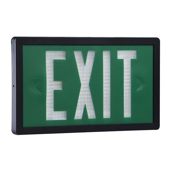 Self-Luminous Exit Sign, Green Background Color, 1 in Overall Depth, 8 1/2 in Overall Height, 14 in Overall Width, Directional Indicators Universal Field Selectable Chevrons, Plastic Housing Material, Life Expectancy 10 yr, Number of Faces 1, Mounting Location Ceiling, End, Wall, Wet Location Rated Environmental Rating, UV Stabilized Housing Finish, Lighting Technology Tritium, 10 Yrs. Manufacturers Warranty Length, Maximum Operating Temperature 176 Degrees F