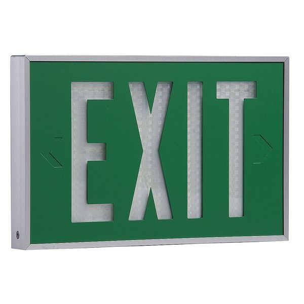 Self-Luminous Exit Sign, Green Background Color, 2 3/4 in Overall Depth, 8 1/4 in Overall Height, 12 3/4 in Overall Width, Directional Indicators Universal Field Selectable Chevrons, Aluminum Housing Material, Life Expectancy 10 yr, Number of Faces 2, Mounting Location Wall, Wet Location Rated Environmental Rating, Painted Housing Finish, Lighting Technology Tritium, 10 Yrs. Manufacturers Warranty Length, Maximum Operating Temperature 176 Degrees F, Minimum Operating Temperature -67 Degrees F