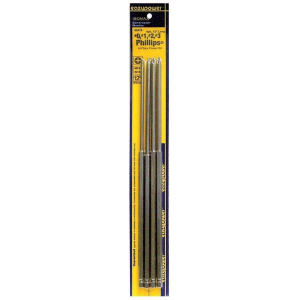 1 in, 1/4 Hex Shank Bits 12 in L, 2 in, 3 in, Phillips #0
