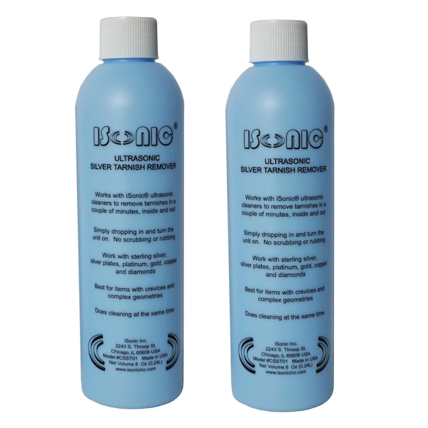 Revive the brilliance of your silver jewelry, flatware, and collectibles with iSonic Ultrasonic Silver Tarnish Remover-a professional-grade solution trusted by jewelers, silversmiths, and serious collectors. Formulated specifically for ultrasonic cleaning machines, this solution effortlessly removes tarnish, oxidation, and surface buildup from silver, gold, platinum, and copper in just one cleaning cycle-without scrubbing or harsh abrasives.Perfect for detailed items like silver chains, antique rings, intricate bracelets, collectible coins, silverware, heirlooms, and ornate decor, the solution reaches into crevices and delicate filigree that polishing cloths simply can't touch. It restores luster while protecting the integrity of precious metals, making it ideal for regular care and long-term preservation.No dilution required. Just pour directly into your ultrasonic cleaner and let the machine do the work. Its low-odor formula is less harsh than traditional chemical dips, making it suitable for use in home environments, studios, repair shops, or retail jewelry counters.Choose the 8 oz 2-pack for personal or occasional use, or the 1-gallon size for larger ultrasonic machines and high-volume cleaning in professional settings.