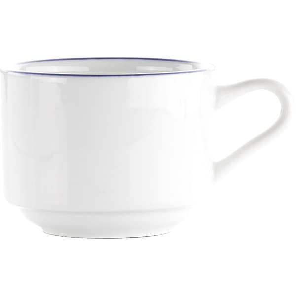 Porcelain w/Blue Stacking Cup,8oz,PK36, Material Porcelain, Color Blue/European White, Overall Height 2 1/2 in, Capacity 8 fl oz, Product Type Stacking Cup, Overall Diameter 3 5/8 in, Package Quantity 36
