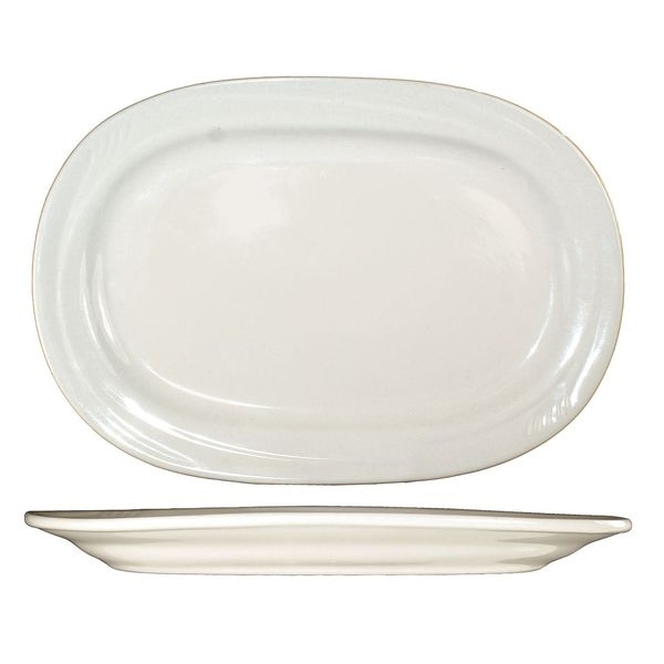Platter, Product Type Dinnerware Platter, Color American White, Diameter Not Applicable, Edge Style Embossed Rim, Handle Included No, Material Stoneware, Maximum Temperature Resistance 350 Degrees F, Overall Length 10 3/8 in, Overall Width 7 1/2 in, NSF Certified No, Pattern Newport, Package Quantity 24