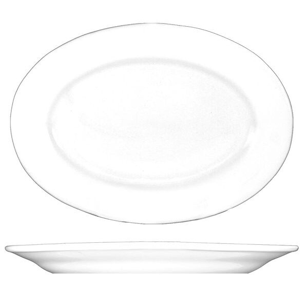 Platter, Product Type Dinnerware Platter, Color European White, Diameter Not Applicable, Edge Style Wide Rim, Handle Included No, Material Porcelain, Maximum Temperature Resistance 350 Degrees F, Overall Length 10 3/8 in, Overall Width 7 1/4 in, NSF Certified No, Pattern Dover, Package Quantity 24