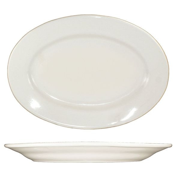 Platter, Product Type Dinnerware Platter, Color American White, Diameter Not Applicable, Edge Style Wide Rim Rolled, Handle Included No, Material Stoneware, Maximum Temperature Resistance 350 Degrees F, Overall Length 8 1/4 in, Overall Width 5 7/8 in, NSF Certified No, Pattern Roma, Package Quantity 36