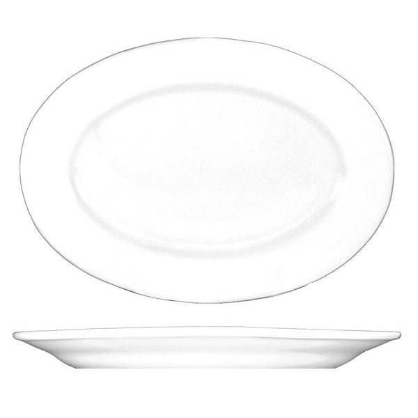Platter, Product Type Dinnerware Platter, Color European White, Diameter Not Applicable, Edge Style Wide Rim, Handle Included No, Material Porcelain, Maximum Temperature Resistance 350 Degrees F, Overall Length 9 3/8 in, Overall Width 6 5/8 in, NSF Certified No, Pattern Dover, Package Quantity 24