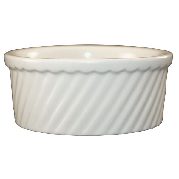 Swirl Souffle Dish, Material Vitrified Stoneware, Capacity 21 oz, Color American White, Dishwasher Safe Yes, Freezer Safe No, NSF Certified No, Oven Safe Yes, Overall Depth 2 1/4 in, Overall Diameter 5 7/8 in, Package Quantity 24