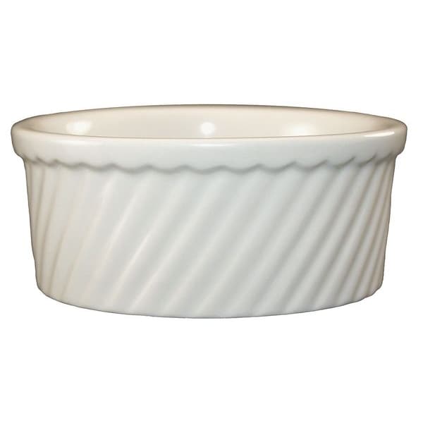 Swirl Souffle Dish, Material Vitrified Stoneware, Capacity 8.5 oz, Color American White, Dishwasher Safe Yes, Freezer Safe No, NSF Certified No, Oven Safe Yes, Overall Depth 1 7/8 in, Overall Diameter 4 3/4 in, Package Quantity 12