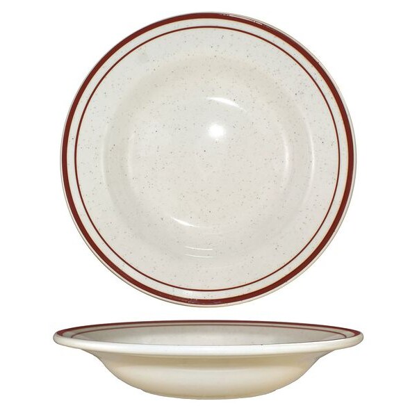 Rimmed Soup Bowl, Color American White; Brown Speckle, Diameter 8 3/4 in, Overall Width Not Applicable, Overall Length Not Applicable, Overall Height 1 3/4 in, Product Type Rimmed Soup Bowl, Capacity 12 oz, Material Stoneware, Edge Style Deep Rim, Pattern Granada, Package Quantity 24