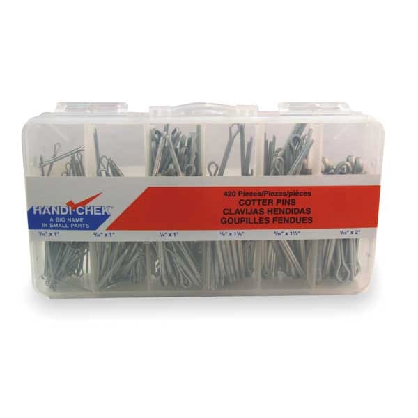 Pin Assortment,420 pcs,6 Sizes, Manufacturer Location Globally Sourced, Made in North America No, Product Type Cotter Pin Assortment, Material Grade/Class 1008, Standards ANSI B 18.8.1, ASME B18.8.1, Number of Pieces 420, Number of Sizes 6, Finish Zinc Plated, Includes (100) 1/16x1 in, (100) 1/8x1 in, (100) 3/32x1 in, (20) 3/16x2 in, (40) 5/32x1 1/2 in, (60) 1/8x1 1/2 in
