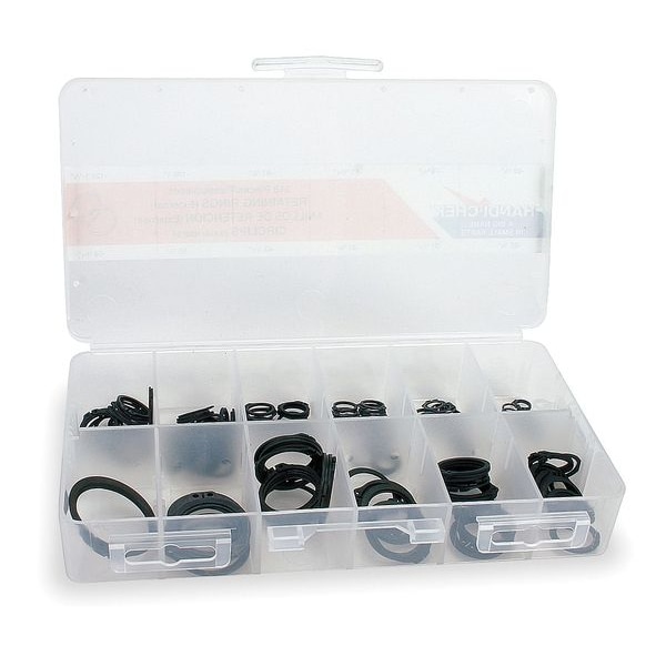 Retaining Ring Assortment,218 pcs,Inch, System of Measurement Inch, Ring Type External Retaining Ring, Material Steel, Finish Black Phosphate, Material Grade/Class Ungraded, Number of Pieces 218, Number of Sizes 12, Location Style External, Made in North America Yes, Manufacturer Location Made in USA*