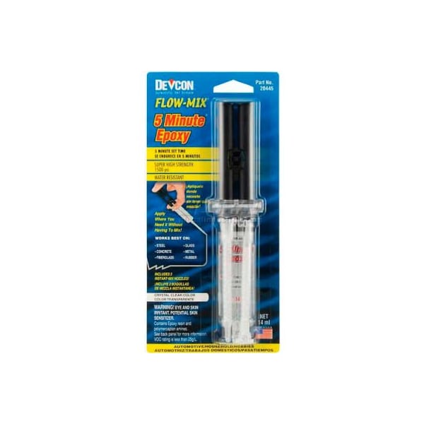 Devon flow-mix 5 minute epoxy syringe, 20445, 14ml syringe a two part, rapid curing, clear, general purpose epoxy. Better on more rigid materials. Useful for repair of autos, bikes, boats and more. May also be used as a metal filler and to restore rotten wood. Apply mixed epoxy directly to your repair. the flow-mix nozzles automatically mixes resin and hardener together. Includes two precision self-mixing nozzles. for use on: metal wood glass ceramic concrete stone china fiberglass