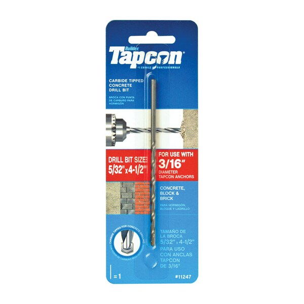 Used for drilling pilot holes in masonry including concrete, block and brick. Engineered to seamlessly work with Tapcon concrete screw anchors ensuring an accurate fit. Carbide tip increases strength and durability allowing for repeated use. Tight bit tolerance provides maximum anchor performance. Use with a hammer drill for best results. Use to install 3/16 in. Tapcon anchors.