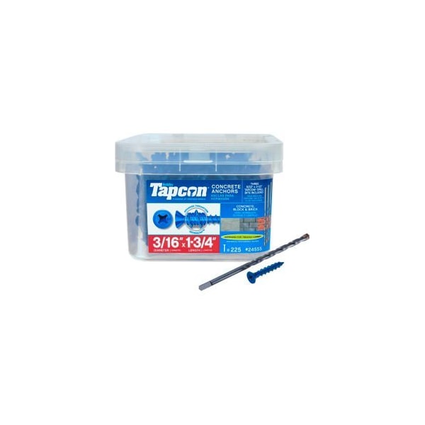 ITW TAPCON CONCRETE ANCHOR - 3/16 X 1-3/4" - PHILLIPS FLAT HEAD - PKG OF 225 - 24555 TAPCON ANCHORS ARE THE PROFESSIONAL'S CHOICE FOR VIRTUALLY ANY CONCRETE APPLICATION. WITH ADVANCED THREADFORM TECHNOLOGY, A CORROSION RESISTANT COATING AND AN INDUCTION HARDENED TIP, THE STRENGTH AND VERSATILITY OF TAPCON ANCHORS PROVIDE A VIABLE ALTERNATIVE TO EXPANSION ANCHORS, PLUGS AND LAG SHIELDS. FEATURES: