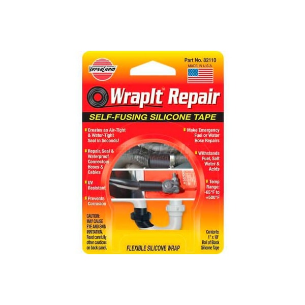 Versachem wrapit repair self-fusing silicone tape, 82110, 1" x 10' tape wrapit repair is a self-fusing silicone repair tape that has been used by the military for years!! an all purpose repair tape that is made out of specially formulated silicone rubber. Contains no adhesives; yet chemically bonds to itself upon contact. Simply stretch and wrap for an airtight, waterproof seal in seconds. Repair and seal all hoses and cables, appliance cords, leaking pipes, repair broken branches and stake plants. Replaces duct tape and electrical tape. Insulates 400 volts per mil. Stretches 300%. for use on: cables appliance cords pipes electrical connections hoses wiring