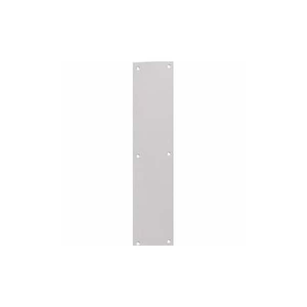 8200Push PlateFeatures:Plates are available in.050 thick brass, stainless steel or aluminumMeets ANSI A156.6 for J301 MaterialsFor 8300 pull plates, plates are prepped with 2 3/8 in holes for pull machiningSpecify PR when ordering a set of plates for back to back mountingPlates are available with cutout for cylinder or thumbturn; standard cutout is 2 in fromtop and centered on plates up to 4 in wide. For plates wider than 4 in cutout is located 2 in from outer edge, specify LH or RH. Standard cutout is 1 1/4 in for cylinder and 3/8 in for thumbturn. Specify CFC for cutout for cylinder or CFT for cutout for thumbturn. Specifications: Available Dimensions:3 in X 12 in3 1/2 in X 15 in4 in X 16 in6 in X 16 in8 in X 16 in Material substrate:Made from aluminum, brass, or stainless steel (300 Series) Mounting:Standard mounting package - #6 X 5/8 oval head screws#6 X 5/8 Torx screwsFinishes:630 - Satin Stainless Steel613 - Oil Rubbed Bronze626 - Satin Chrome628 - Satin Aluminum612 - Satin Bronze619 - Satin Nickel625 - Bright Chrome605 - Bright Brass
