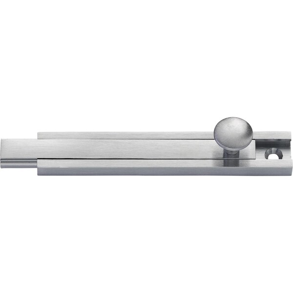 40B26D 4 in Light-Duty Surface Bolt - Satin Chrome -Recommended for 1 3/8 in and 1 3/4 in hollow core doors or door partitions -Concealed screw design enhances appearance and security -Exceptional strength and durability provided by interlocking construction of heavy gauge track and rod -Permanent stop prevents rod disengagement from track -Tension spring holds bolt in desired position -Track assures smooth operation and interlocks with side edges of rod to eliminate marring -Decorative 5/8 in diameter knob designed to facilitate bolt operation -Available in 3 in, 4 in and 6 in lengths -Units packed with wood screws -Packed with both universal and mortise strikes