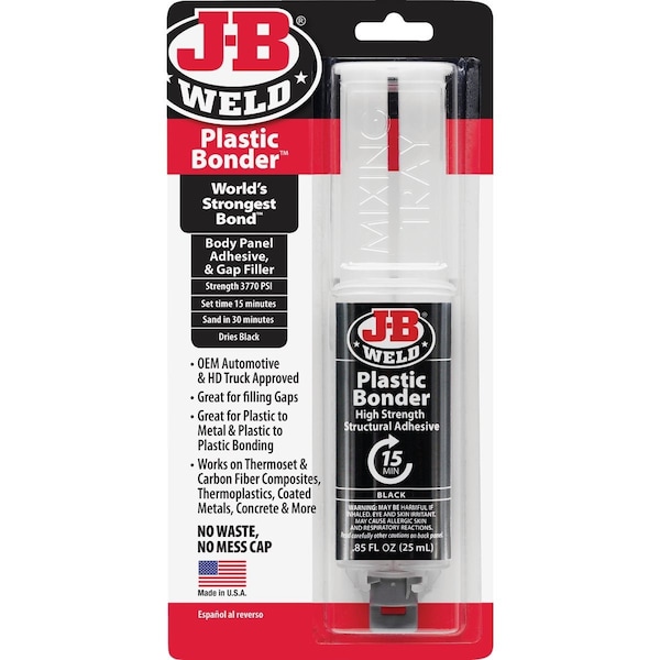 High strength structural adhesive. OEM (Original Equipment Manufacturer) automotive and heavy-duty truck approved panel adhesive. Great for filling dents replacement bonding of plastics and general repairs. Works on thermoset and carbon fiber composites thermoplastics coated metals and concrete. 1:1 mixing ratio. Features a no waste no mess cap.
