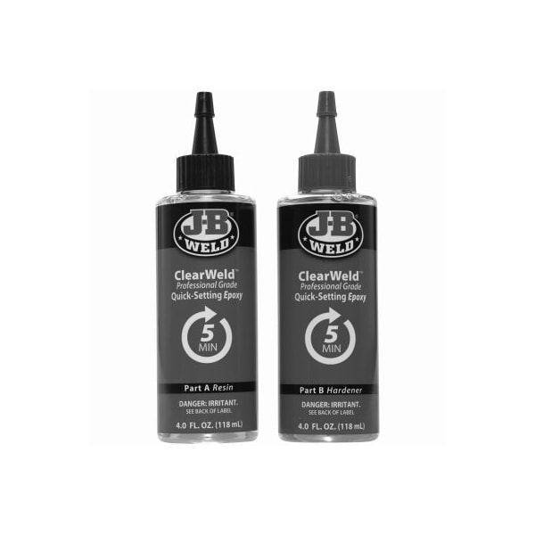 JB Weld ClearWeld Pro Size Syringe is a quick setting, multipurpose two part epoxy that provides a strong and lasting bond on most surfaces including tile, most plastics, ceramic, glass, wood and metal ClearWeld is designed to cure with a clear, transparent bond when used at thicknesses of less than 15 mil ClearWeld has a 11 mixing ratio, sets in 5 minutes and cures in 1 hour With a tensile strength of 3900 PSI, ClearWeld sets to a hard, permanent bond